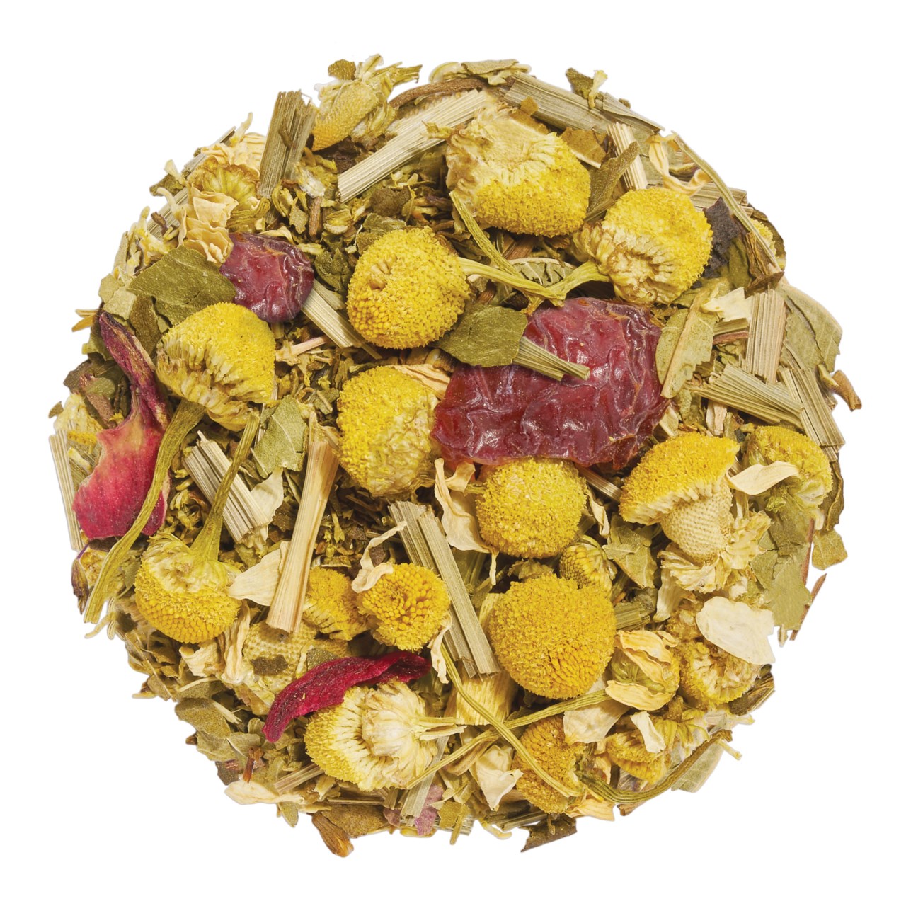 混合金黃陽光色的埃及洋甘菊花朵與玫瑰果實,再調合充滿草原清香的檸檬香草與天然薄荷葉。美味詳和的口感讓人心情十足的放鬆並恢復精神。